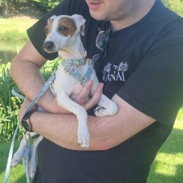 - Features a custom engraved nameplate, breakaway quick-release buckle, and matching padded leash for safety and style.