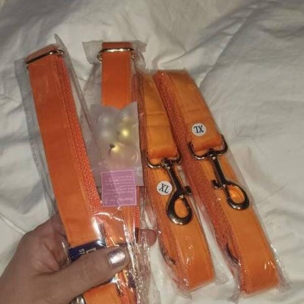 Orange Velvet Personalized Dog Collar, Leash & Harness Set