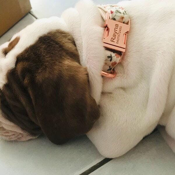 - Features a custom engraved nameplate, breakaway quick-release buckle, and matching padded leash for safety and style.